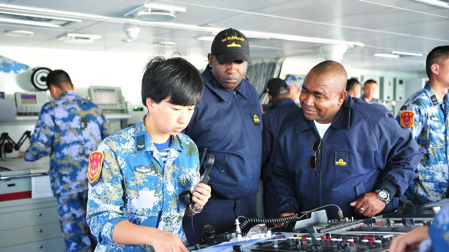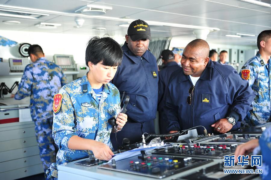 La 16e escorte de la marine chinoise a procédé pour la première fois à des exercices de déplacement et de communication avec la marine namibienne au large de la baie de Walvis. Réunion des officiers des deux marines à bord de la frégate chinoise Yancheng. Photos prises le 10 juin.