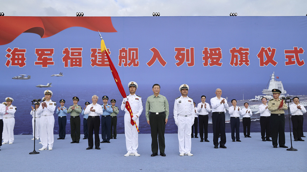 Le président Xi Jinping a assisté mercredi à la cérémonie de mise en service et de remise du pavillon du Fujian, premier porte-avions chinois équipé de catapultes électromagnétiques, dans la province de Hainan, dans le sud de la Chine.