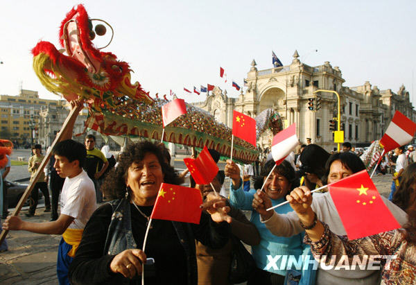 Le 19 novembre, devant le palais présidentiel de Lima, capitale du Pérou, les habitants locaux assistent à un spectacle de danse du dragon et agitent les drapeaux nationaux chinois et péruvien.