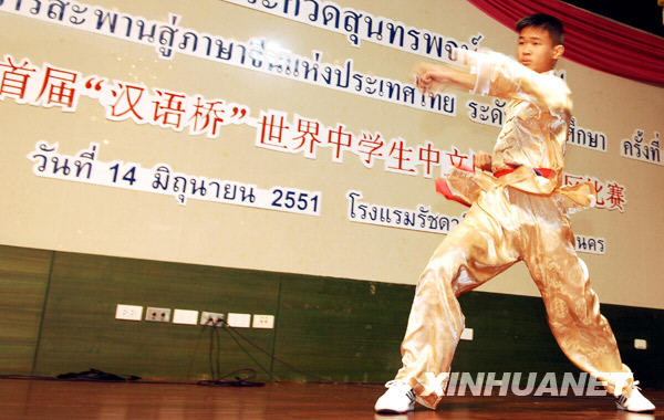 Le 14 juin, à Bangkok, capitale de la Thaïlande, un lycéen thaïlandais en train d'effectuer une représentation de kung-fu lors d'un concours international de langue chinoise.