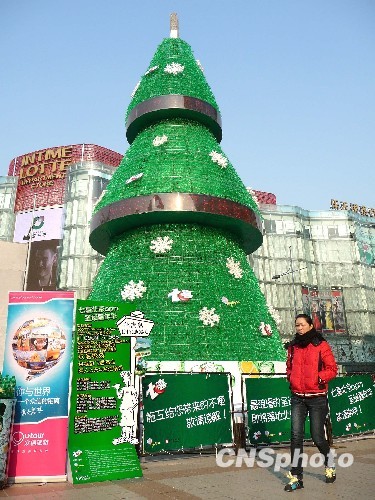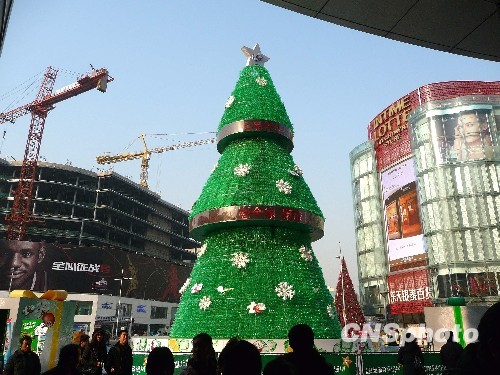 Un sapin de Noël haut de 15 mètres a été installé le 6 décembre à Wangfujing, la rue commerçante la plus animée de Beijing. Une dizaine de milliers de bouteilles ont ainsi été recyclées pour former ce sapin respectueux de l'environnement.
