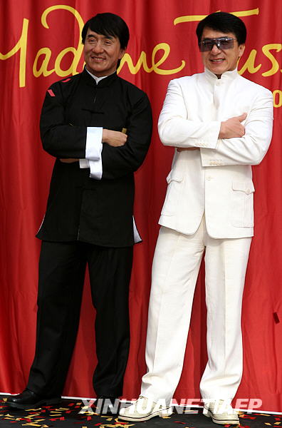 Le 11 janvier, au musée de cire de Madame Tussauds, à Hollywood en Californie, l'acteur Jackie Chan (à droite) pose à côté d'une figure de cire extrêmement ressemblante.