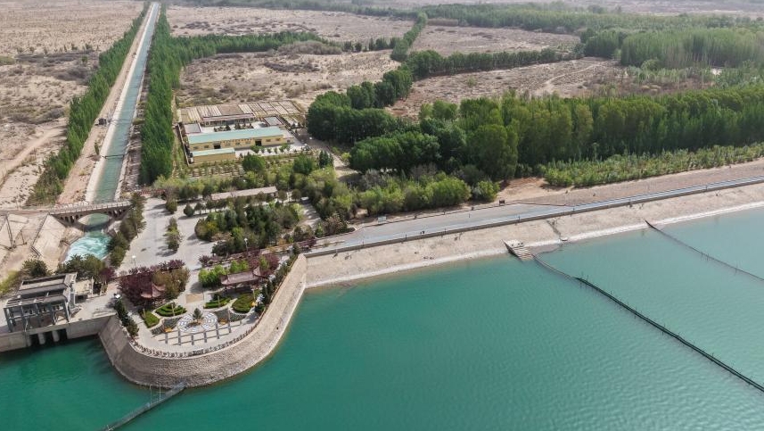 Au printemps, le réservoir de Hongyashan, situé au xian de Minqin, à Wuwei, dans la province du Gansu (nord-ouest), est telle une perle étincelante dans le désert.