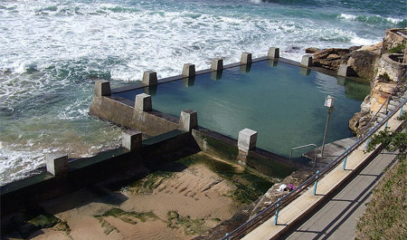 Une piscine au bord de la mer dont les murs rappellent les fortifications d'un château de sable, à Sydney.