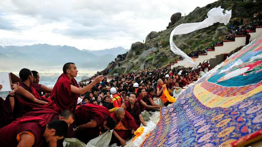 Le 25 août à Lhassa, le temple Zhebang a déployé un tangka géant du bouddha Sakyamuni que de nombreux croyants et touristes sont venus contempler. Ce rituel marque le début du festival de Shoton célébré tous les ans à Lhassa. La fête, dont l'origine remonte au milieu du 11e siècle, a été inscrite au patrimoine culturel immatériel de l'humanité en 2006.
