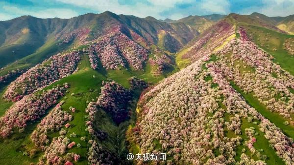 Les fleurs d'abricotiers sauvages recouvrent les vallées du Xinjiang de rose