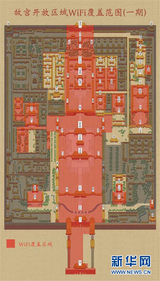 L'accès gratuit au wifi à l'intérieur de la Cité interdite, ce n'est plus un rêve ! Depuis le 1er août, la Cité interdite propose aux visiteurs un accès gratuit au wifi via le réseau « PalaceMuseum-WiFi », disponible dans les zones marquées en rouge sur la photo ci-dessus. Pour l'instant, ce service couvre la plupart des zones centrales de la Cité interdite.