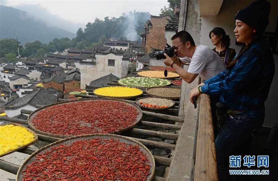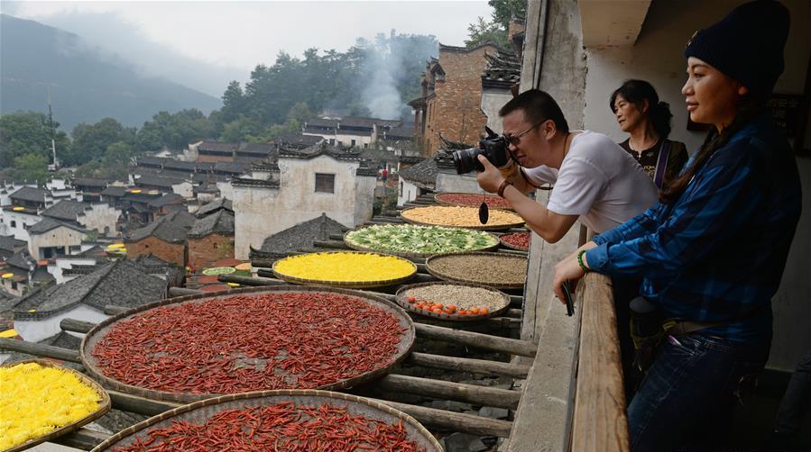- Photo prise le 27 octobre dans le vieux village de Huangling du xian de Wuyuan au Jiangxi. La technique de séchage shaiqiu (littéralement « bain de soleil en automne ») attire de nombreux touristes.