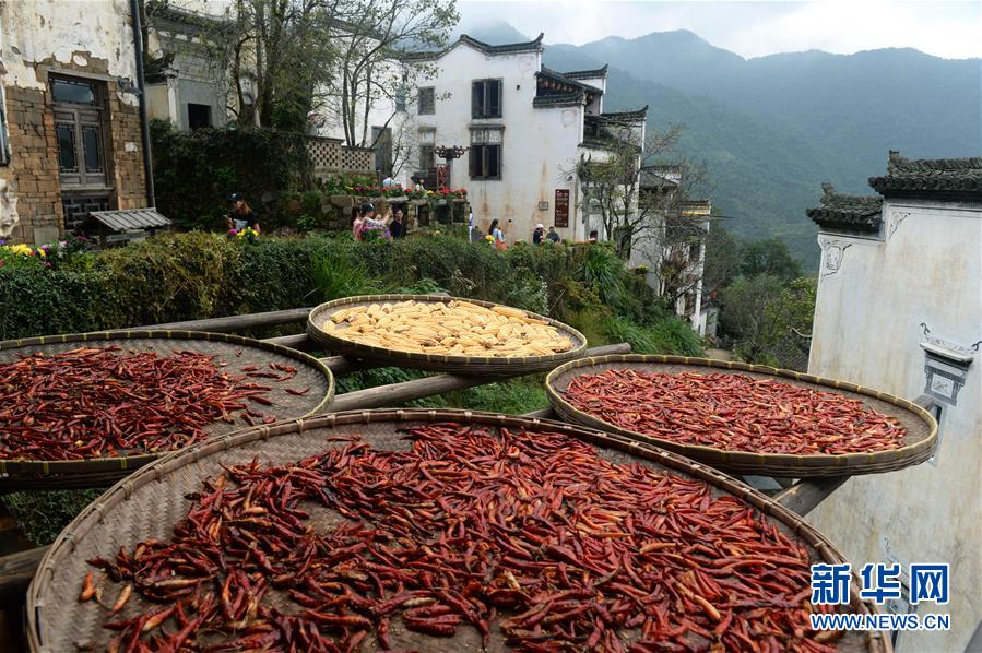 - Photo prise le 27 octobre dans le vieux village de Huangling du xian de Wuyuan au Jiangxi. La technique de séchage shaiqiu (littéralement « bain de soleil en automne ») attire de nombreux touristes.