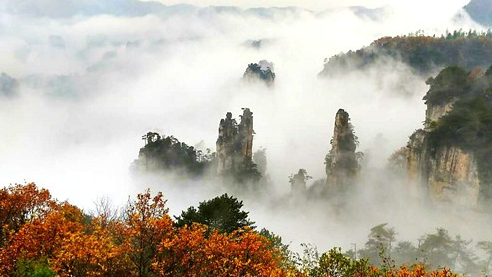 Le 14 novembre, le site d'information People.rednet.cn de Zhangjiajie (correspondants : Zhou Huaibai et Deng Daoli) a publié des photos du site de Wulingyuan et des monts Tianzi de la région paysagère de Hexin (Zhangjiajie) sous la pluie battante. Les sommets rocheux perchés sur les nuages donnent au paysage une allure surréaliste. La mer de nuage qui s'étend à perte de vue semble sortie de l'imagination d'un peintre, tout comme les pics montagneux percent à travers les nuages de brume. Un paysage à couper le souffle.