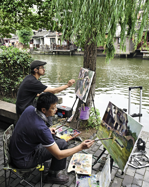Deux hommes dessinent sur le vif à Xitang. (PHOTOS : WANG WENJIE)