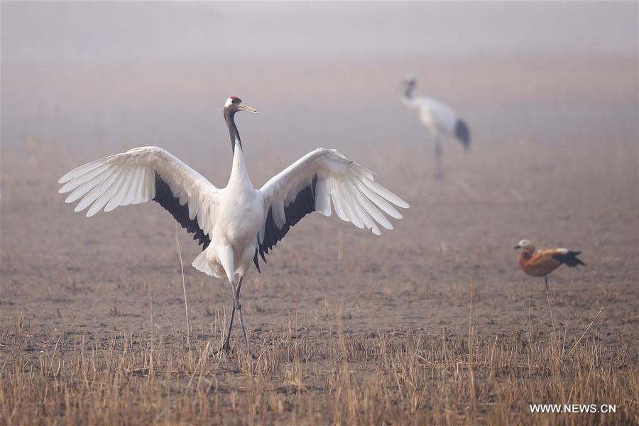 Des grues à couronne rouge (grues du Japon ou Dandinghe en chinois), vues dans une réserve naturelle nationale à Yancheng, dans la province du Jiangsu (Est de la Chine), le 16 février 2017.