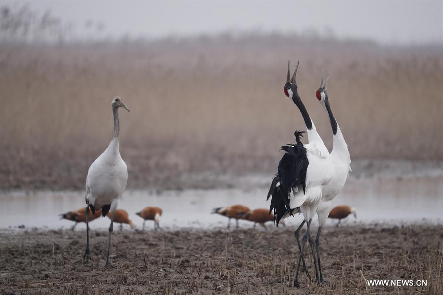 Des grues à couronne rouge (grues du Japon ou Dandinghe en chinois), vues dans une réserve naturelle nationale à Yancheng, dans la province du Jiangsu (Est de la Chine), le 16 février 2017.