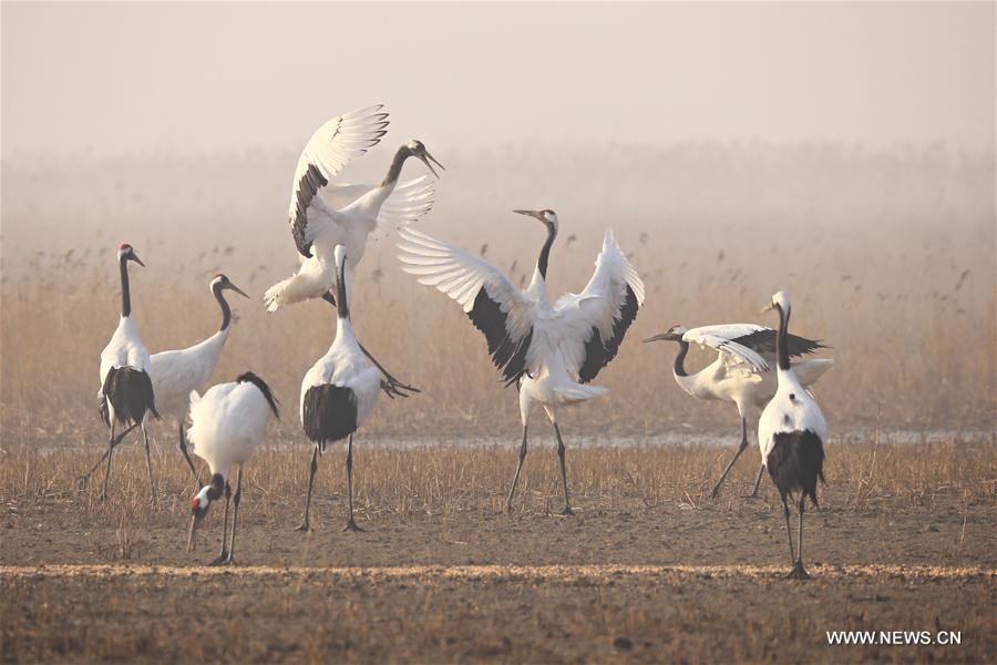 Des grues à couronne rouge (grues du Japon ou Dandinghe en chinois), vues dans une réserve naturelle nationale à Yancheng, dans la province du Jiangsu (Est de la Chine), le 16 février 2017.