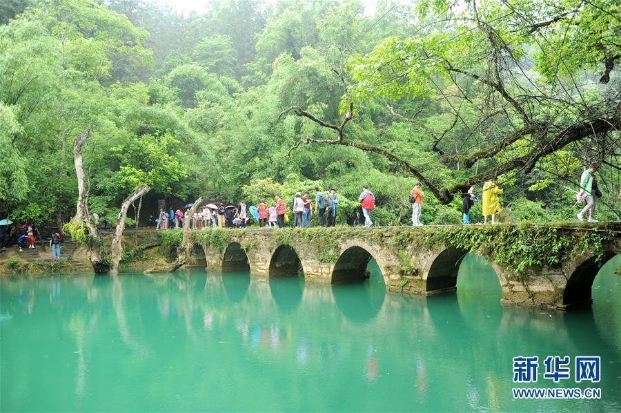 Le 19 mai, des touristes s’amusent au site de Xiaoqikong dans le xian de Libo (province chinoise du Guizhou). Les paysages pittoresques et les températures agréables des lieux attirent chaque année un grand nombre de touristes.