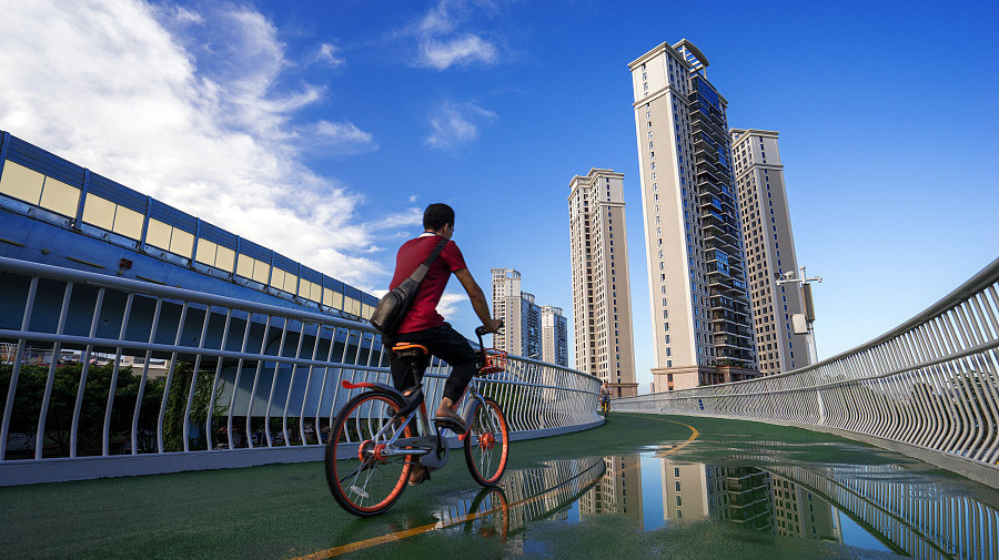 Un cycliste roule sur une piste cyclable surélevée à Xiamen, dans la province du Fujian (sud-est de la Chine), le 3 août 2017. La route s'étend sur 7,6 kilomètres, ce qui en fait la plus longue du monde et la première de son genre en Chine.