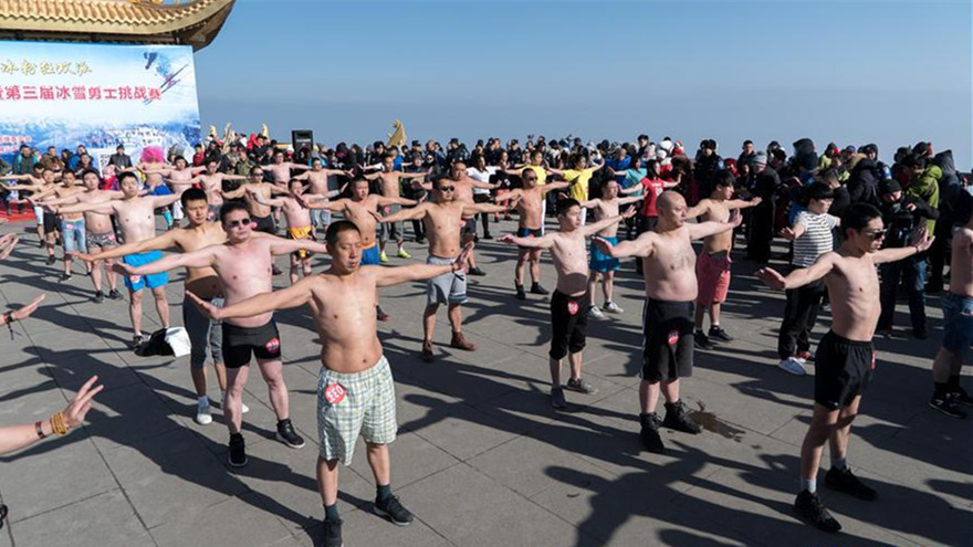 Une centaine de personnes se déshabillent pour participer à une compétition de défi du froid sur le mont Emei, dans la province du Sichuan (sud-ouest de la Chine), le 23 décembre 2017. Le mont Emei, l'une des quatre montagnes sacrées du bouddhisme en Chine, a été classé sur la liste du patrimoine mondial par le Comité du patrimoine mondial de l'UNESCO.