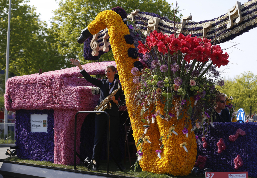 Parade annuelle des fleurs à Lisse, aux Pays-Bas, le 21 avril 2018. Vingt chars recouverts de fleurs ont parcouru un trajet de 42 kilomètres reliant Noordwijk à Haarlem au cours de l'événement, attirant plus d'un million de visiteurs néerlandais et étrangers.