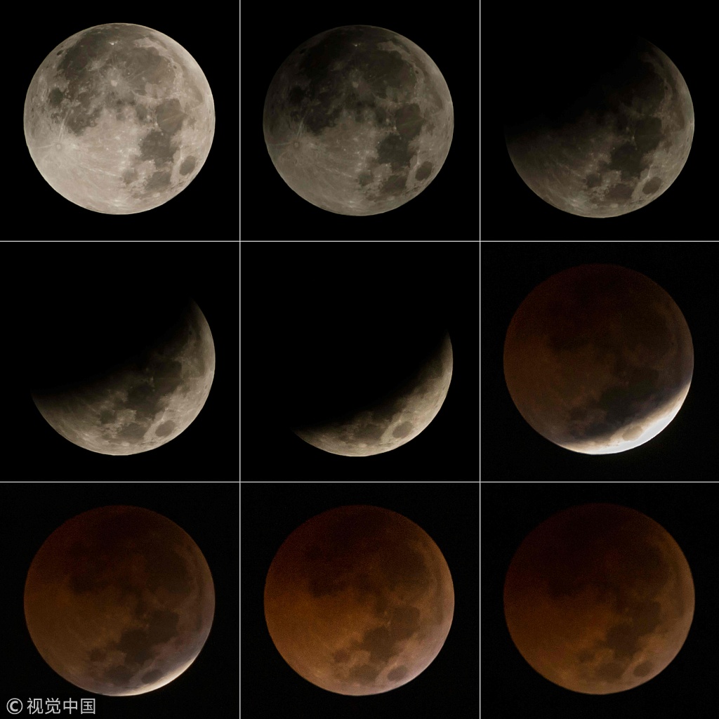 Ce montage d’images montre les transitions de la pleine Lune au cours de l’éclipse de la Lune rousse, à Jakarta, le 27 juillet 2018.