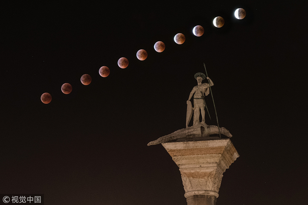 Une éclipse lunaire totale est observée dans le ciel sur le lagon de Venise au-dessus de la statue de San Todaro sur la place Saint-Marc le 27 juillet 2018, à Venise. La durée de l’éclipse totale, quand l'ombre de la Terre porte directement sur la Lune et qu'elle est la plus rousse, a été d’une heure, 42 minutes et 57 secondes, ce qui en fait la plus longue éclipse lunaire visible de ce siècle.