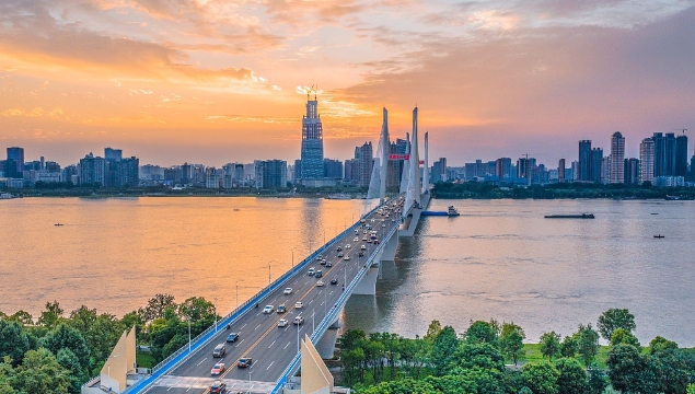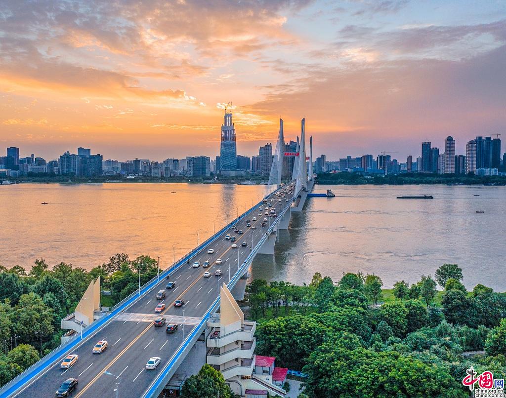Photo prise le 23 juin, montrant le second pont du fleuve Yangtsé, à Wuhan, sous les reflets pourpres du soleil couchant.