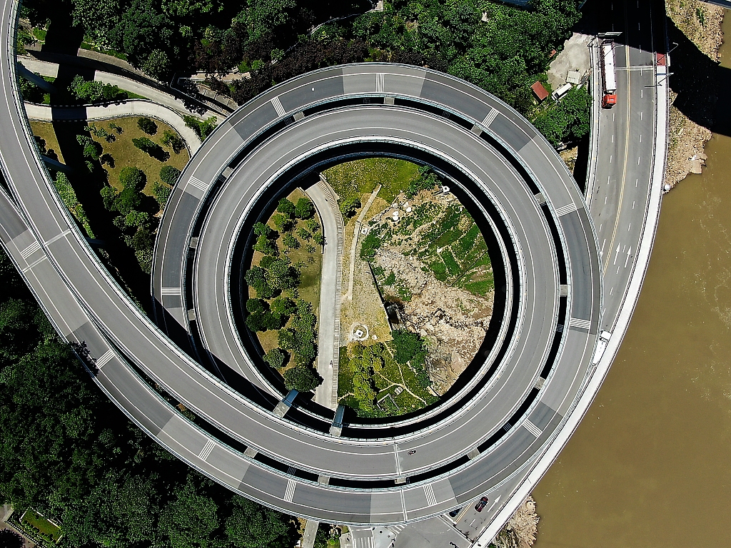 Une vue aérienne de l’échangeur routier en spirale reliant le pont sur le Yangtsé de Fuling à la rive sud du fleuve, dans le district de Fuling, à Chongqing (sud-ouest de la Chine), le 14 juillet 2019. (Photo / VCG)