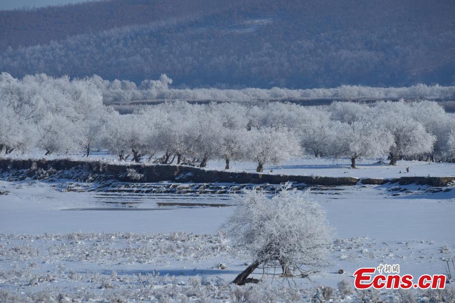 Photo prise le 30 octobre 2019, montrant un paysage de givre dans la section de Huma du fleuve Heilongjiang, également connu sous le nom de fleuve Amour, dans la province du Heilongjiang (nord-est de la Chine).