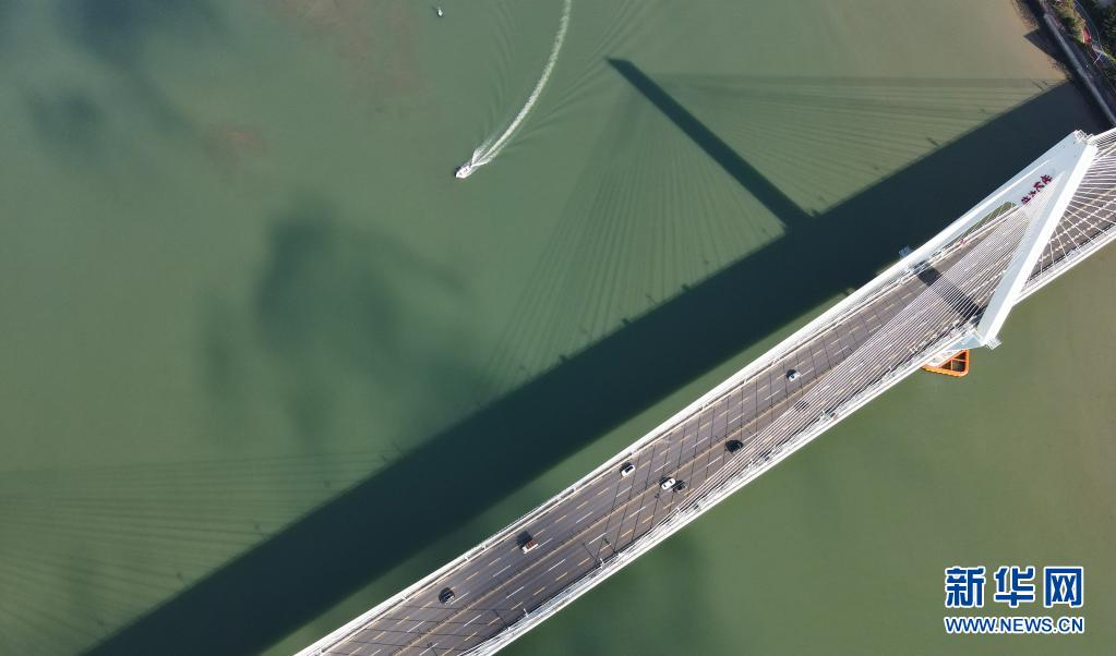 Un petit bateau passe près du Pont du siècle de Haikou. (Photo prise par un drone le 3 mai) (Yang Guanyu Xinhua)