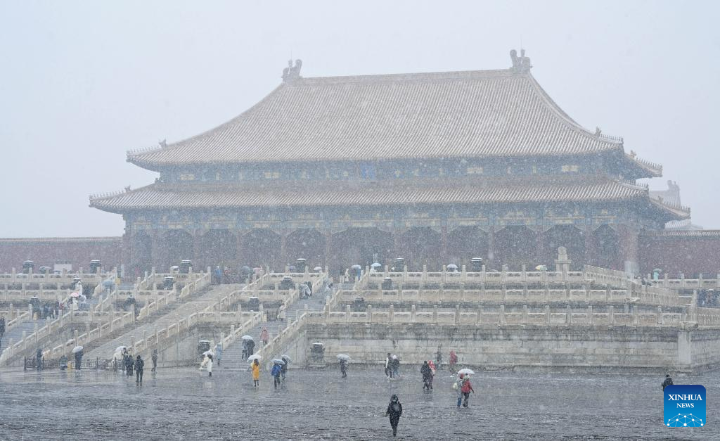 Des gens visitent le Musée du Palais, plus connu sous le nom de Cité Interdite, sous la neige, le 18 mars 2022 à Beijing. (Yin Dongxun / Xinhua)