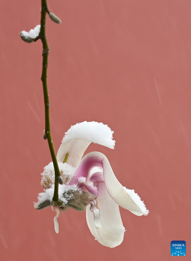 Une fleur de magnolia épanouie vue au milieu de la neige à l'extérieur du Musée du Palais, plus connu sous le nom de Cité Interdite, le 18 mars 2022 à Beijing. (Yin Dongxun / Xinhua)