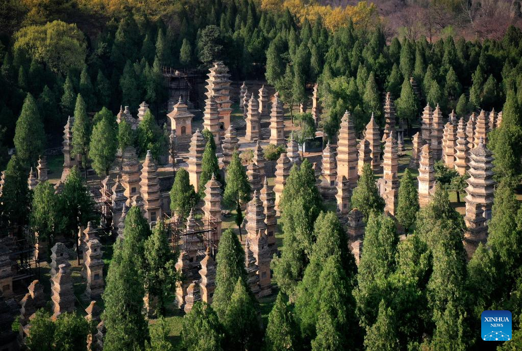 Photo aérienne prise le 7 avril 2022 montrant la Forêt des Pagodes du temple de Shaolin à Dengfeng, dans la province du Henan (centre de la Chine). Situés au « centre du ciel et de la terre », les monuments historiques de Dengfeng comprennent notamment l'ancien complexe architectural du mont Songshan.