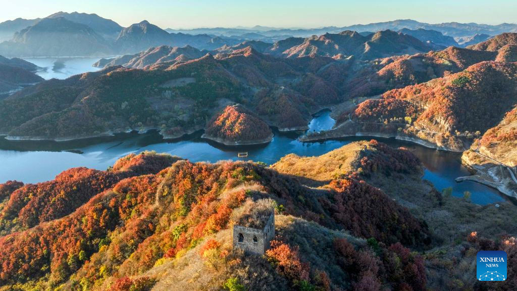 Photo aérienne prise le 24 octobre 2022 montrantun paysage d’automne d’une section de la Grande Muraille dans la province du Hebei (nord de la Chine).