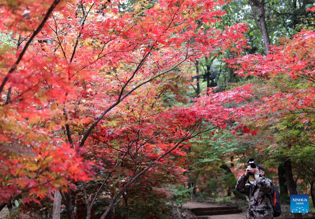 Un homme prend des photos dans le parc Heilongtan à Kunming, capitalede la province du Yunnan (sud-ouest de la Chine), le 28 octobre 2022.