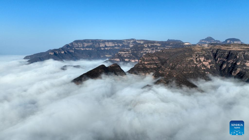 Photo aérienne prise le 19 novembre 2022 montrant une mer de nuages dans les monts Taihang, dans le canton de Liushigang de la ville de Shahe, dans la province du Hebei (nord de la Chine).