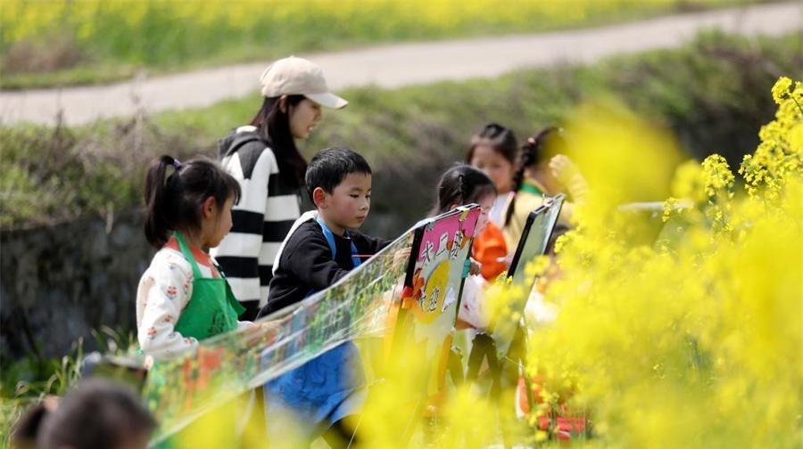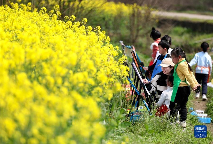 Des enfants dessinent près d’un champ de fleurs de colza dans le village de Gaoma, dans la province du Hunan (centre de la Chine), le 28 février 2023. Au début du printemps, des enfants d’une école maternelle de Zixing, dans la province du Hunan, sont venus admirer les fleurs de colza dans le village de Gaoma et découvrir à cette occasion la beauté du printemps en plein air. (Photo / Xinhua)