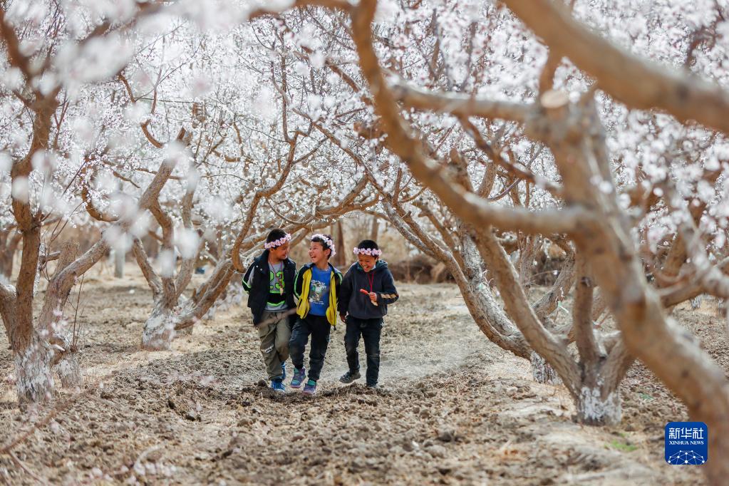 Un festival de fleurs d’abricotiers a débuté le 18 mars au village de Nanhu, près de Turpan, dans la région autonome ouïghoure du Xinjiang (nord-ouest). Avec la hausse des températures, plusieurs régions du Xinjiang sont entrées dans leur haute saison touristique. (Photo : Hao Zhao/Xinhua)