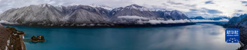 Après des chutes de neige, le lac Pagsum Co, la forêt environnante et le ciel bleu ont offert à la vue une image splendide.
