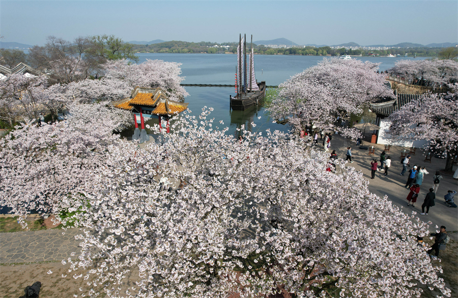 Des milliers de cerisiers sont récemment entrés en floraison au site de Yuantouzhu, à Wuxi, attirant de nombreux visiteurs.