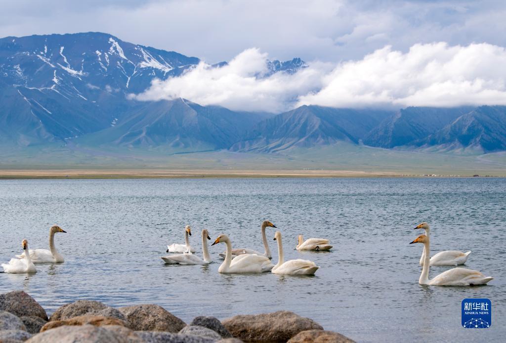 Des cygnes sur le lac Sayram, dans la région autonome ouïghoure du Xinjiang (nord-ouest de la Chine), le 21 mai.