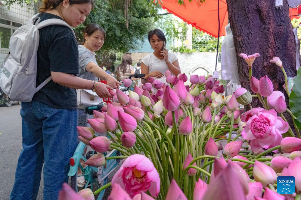 Des gens choisissent des boutons de lotus dans un étal de fleurs à Chengdu, capitale de la province du Sichuan (sud-ouest de la Chine), le 14 juillet 2023. Egalement connus sous le nom d’Universiades, les 31e Jeux mondiaux universitaires d'été de la Fédération internationale du sport universitaire (FISU) auront lieu à Chengdu du 28 juillet au 8 août 2023. (Tang Wenhao / Xinhua)