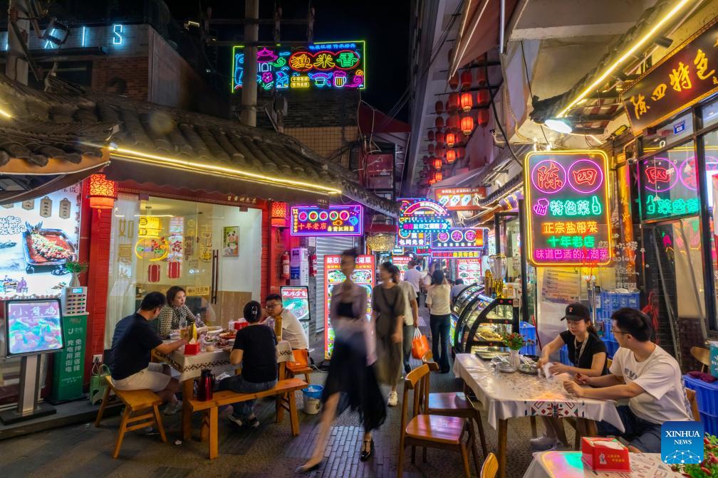 Des visiteurs passent devant les panneaux d'une rue de la gastronomie à Chengdu, capitale de la province du Sichuan (sud-ouest de la Chine), le 11 juin 2023.