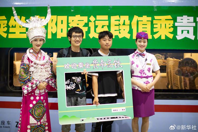 Les conducteurs, hôtesses de train et mécaniciens du premier train ont fait leur première apparition à Guiyang, capitale de la province du Guizhou (sud-ouest de la Chine).