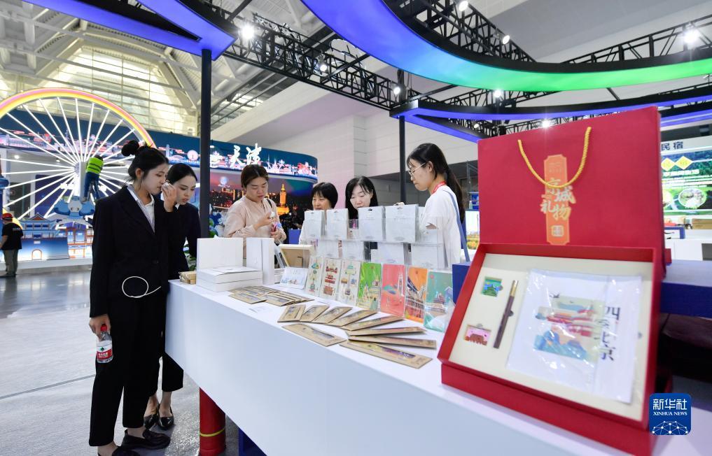 Des invités et des journalistes découvrent des produits culturels créatifs au Centre national des congrès et des expositions, à Tianjin, le 31 août 2023. La 13e Exposition de l'industrie touristique de Chine se déroulera du 1er au 3 septembre, à Tianjin. Pendant l’événement, des réalisations et des technologies de pointe dans le développement du tourisme intelligent du pays seront présentées à travers huit grandes sections d’exposition. (Sun Fanyue / Xinhua)