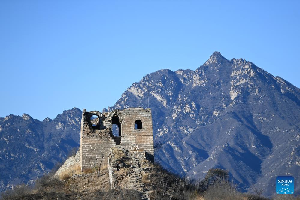 Photo prise le 14 novembre 2023 montrant une tour de guet de la Grande Muraille de Gubeikou à Beijing. La Grande Muraille de Gubeikou est située dans le canton de Gubeikou, dans le district de Miyun Beijing. La défense de la Grande Muraille fut une partie importante de la première guerre de résistance du peuple chinois contre l’agression japonaise. En 1933, les troupes chinoises s’y opposèrent aux envahisseurs japonais, notamment sur les sections de Lengkou, Xifengkou et Gubeikou de la Grande Muraille.