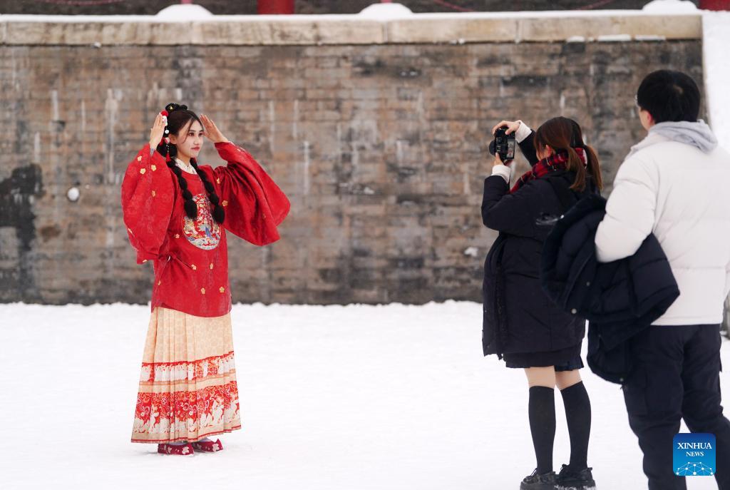 En photos : des touristes visitent la Cité interdite sous la neige à Beijing