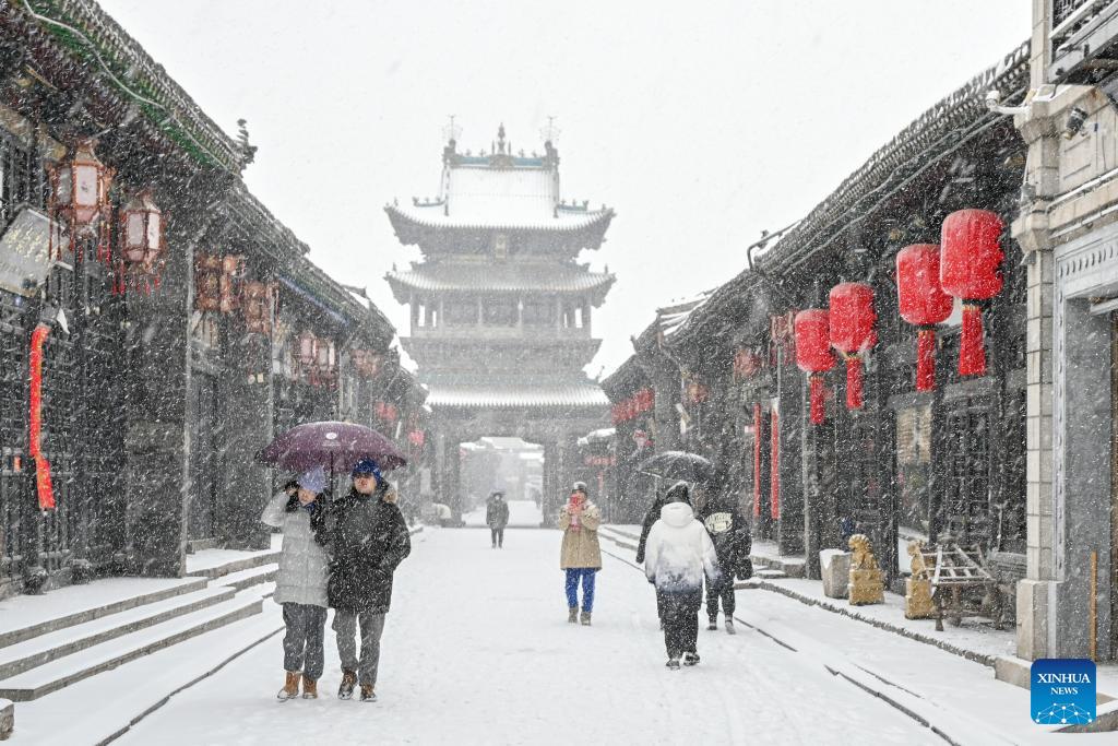 Des touristes visitent la vieille ville de Pingyao, dans la province du Shanxi (nord de la Chine) au milieu de chutes de neige, le 14 décembre 2023. (Liang Shengren / Xinhua)