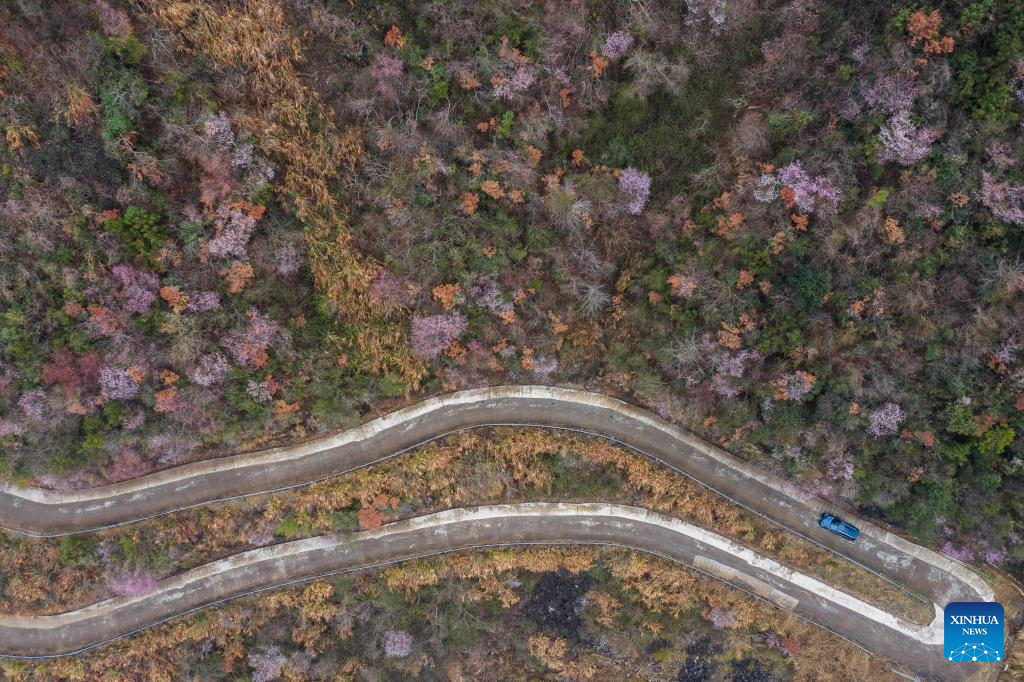 Photo aérienne prise par un drone le 6 mars 2025 montrant des cerisiers en fleurs dans le village de Datang du canton de Sandu, à Jiande, dans la province du Zhejiang (est de la Chine). Ces dernières années, le canton de Sandu a aidé les résidents locaux à augmenter leurs revenus en faisant la promotion d'itinéraires touristiques saisonniers s'appuyant notamment sur les fleurs de montagne, des sites de camping et le logement chez l'habitant. (Xu Yu / Xinhua)