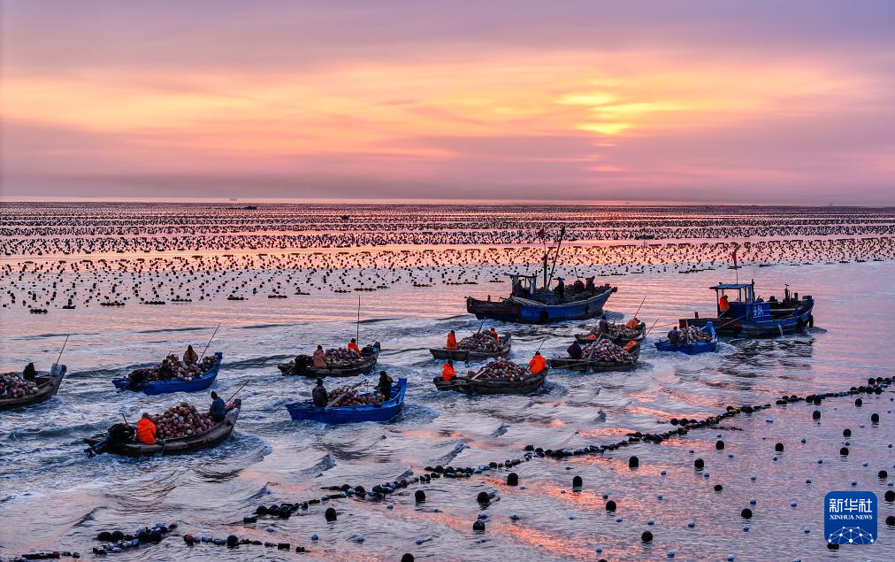 Photo aérienne prise le 13 mars 2025, montrant des pêcheurs travaillant sous les reflets du soleil levant dans un ranch marin de la baie de Rongcheng, dans la province chinoise du Shandong (est). (Li Xinjun/Xinhua)