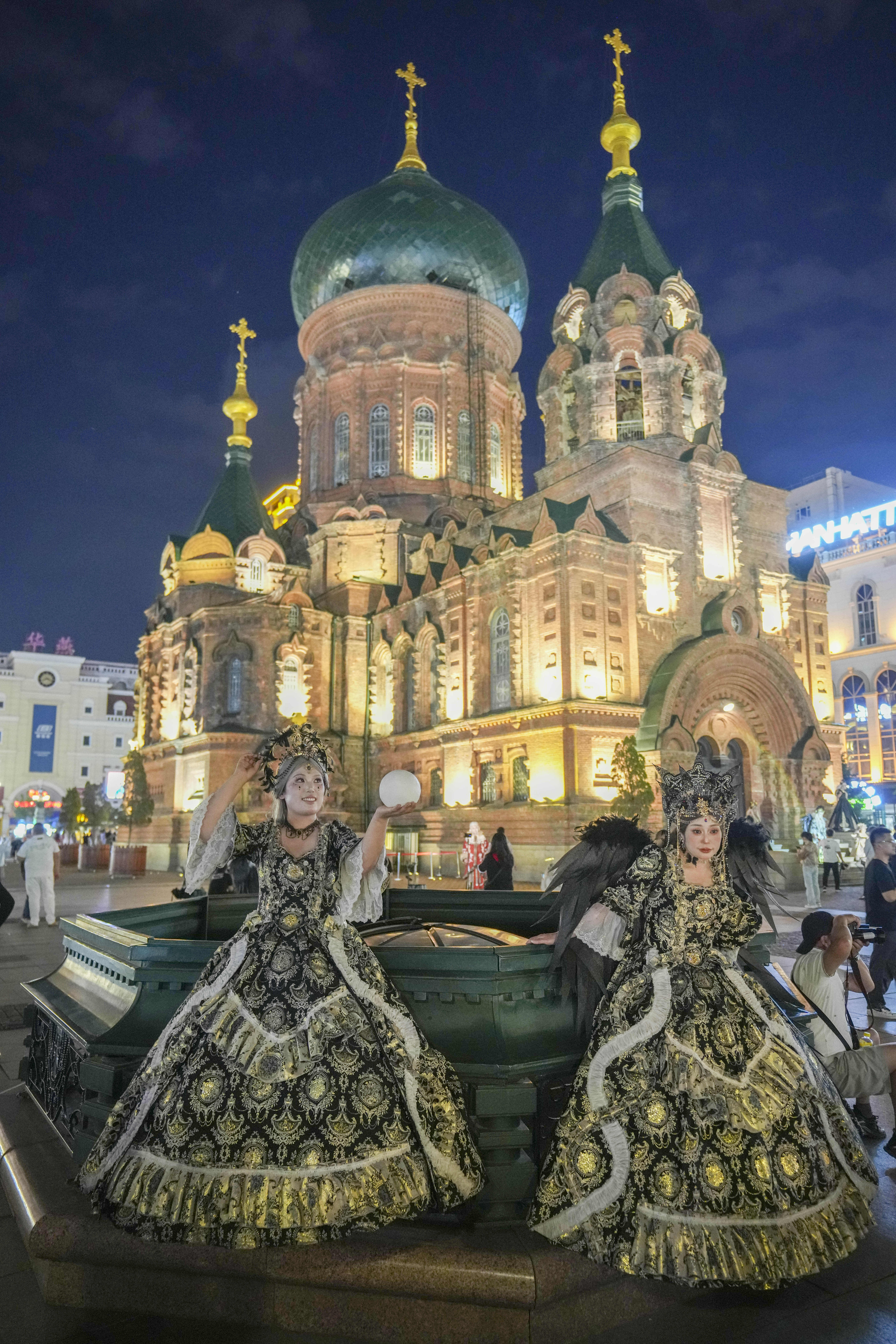 Photo prise le 23 janvier, montant des visiteurs devant la cathédrale Sainte Sophia, à Harbin, dans la province du Heilongjiang (nord-est). Suite à la construction du chemin de fer de l'Est chinois en 1898, de nombreux immigrants européens sont venus s’installer à Harbin. En une centaine d’années, Harbin, qui était à l'origine un petit village de pêcheurs, est devenue aujourd’hui une grande métropole. La ville abrite aujourd’hui plus de 1000 bâtiments historiques de styles architecturaux différents – byzantin, néoclassique, Art déco, baroque – et a ainsi été surnommée le « Musée de l’architecture universelle ».