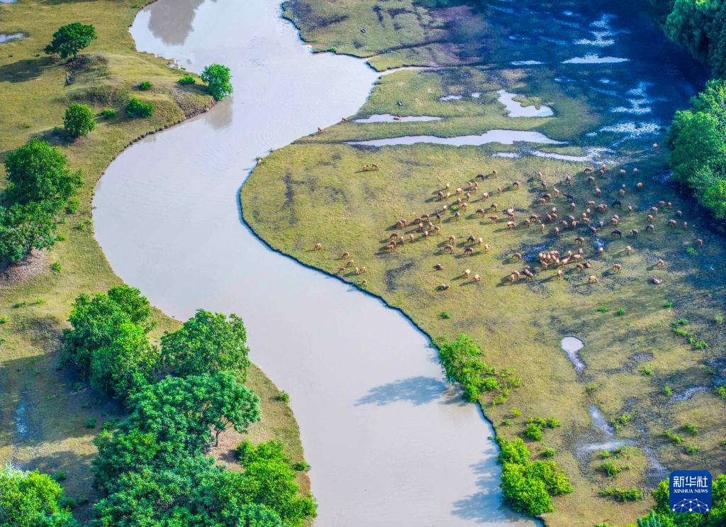 Le 11 septembre, un groupe d'élans se nourrissent et jouent dans le parc national des zones humides de Qinhu, à Taizhou, dans la province du Jiangsu (est). (Photo prise par drone)